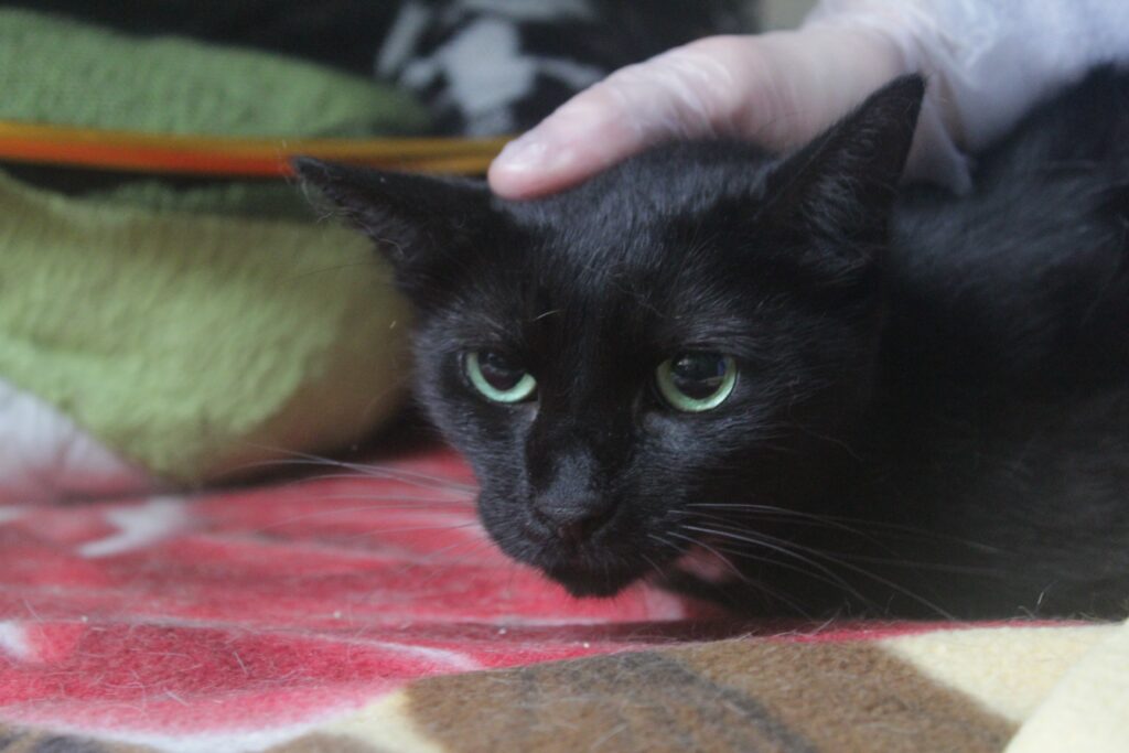 Regina je zatím z kočiček nejplašší. Schovává se pod stolem a zatím se lidí bojí. Když jí ale vytáhneme, abychom jí zkontrolovali, mazlí se stejně jako její kámoši. Potřebuje jen o trochu víc trpělivosti.