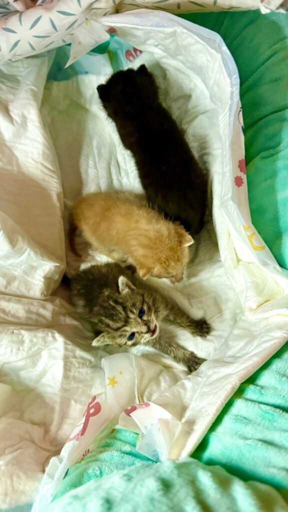 pro tři kočičí sirotky, odhadem asi desetidenní (viz foto), naléhavě hledáme kojící kočku. Maminku jim přejelo auto a paní, která je u ní našla je dlouhodobě krmit stříkačkou nemůže kvůli pracovnímu vytížení.
