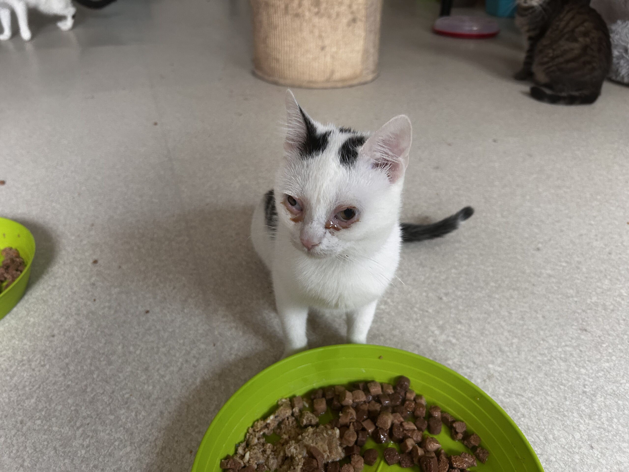 Možná si z loňského roku pamatujete kočičku Canneloni a její italskou rodinku. A možná vám tím pádem neuniklo, že nebyla jediná z koček, které jsme před rokem přijali od pána, který si je doma nahromadil. Kočky samozřejmě nebyly kastrované a množily se nekontrolovaně navzájem. A tak vznikl náš Rakeťák, kocourek, se kterým se genetika zrovna nemazala. Když se na něj podíváte, řeknete si - to musí být koťátko! Ale není to tak úplně pravda. Rakeťákovi už je přes rok, růstově se však zasekl na velikosti přibližně pětiměsíčního koťátka. Aby toho nebylo málo, od malinka má epilepsii, takže jednou denně musí brát prášek. Narodil se také se špatně vyvinutýma očima - má špatné slzné kanálky a víčka měl vtočená dovnitř. Víčka se v září vyřešila plastickou operací, ale kvůli slzným kanálkům je Rakeťák pořád ušmudlaný. No soutěž krásy by nevyhrál. I přes svoje hendikepy to ale je frajer. Je to šéf celého pokoje, zvlášť teď, když odjeli dva jeho konurenti, Valentýn a Viggo, do nových domovů. Rakeťák musí výt u misek všude první a energie má také nazbyt.